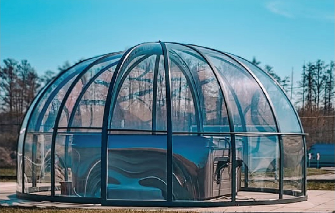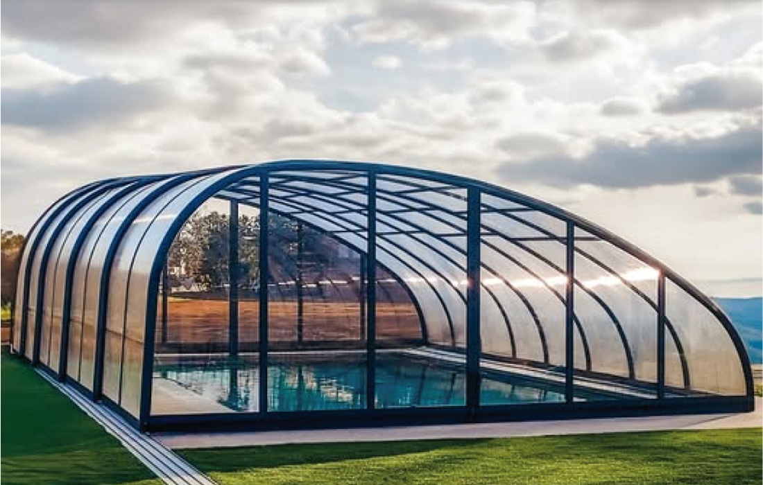 Die Konstruktion wird wahlweise mit 10 mm starken, mehrwandigen Polycarbonatplatten oder mit 4 mm massivem Polycarbonat in klarer Ausführung gefertigt. Diese sorgen für eine sehr gute Wärmedämmung, hohe Lichtdurchlässigkeit und zuverlässigen Schutz vor Witterungseinflüssen, wodurch die Nutzung des Pools deutlich verlängert wird.